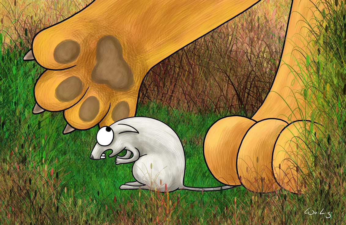 2. 巨掌袭来,狮子本能地抓住老鼠。小老鼠求饶:「狮子大大,饶了我吧!总有一天我会报答你的!」