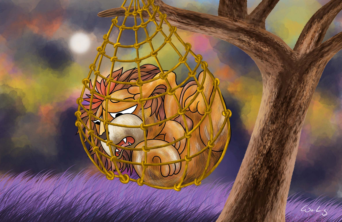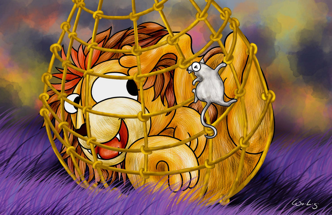 5. 路过的老鼠发现後,说:「狮子大大别怕,我来帮你!」并迅速地啃起了绳索。