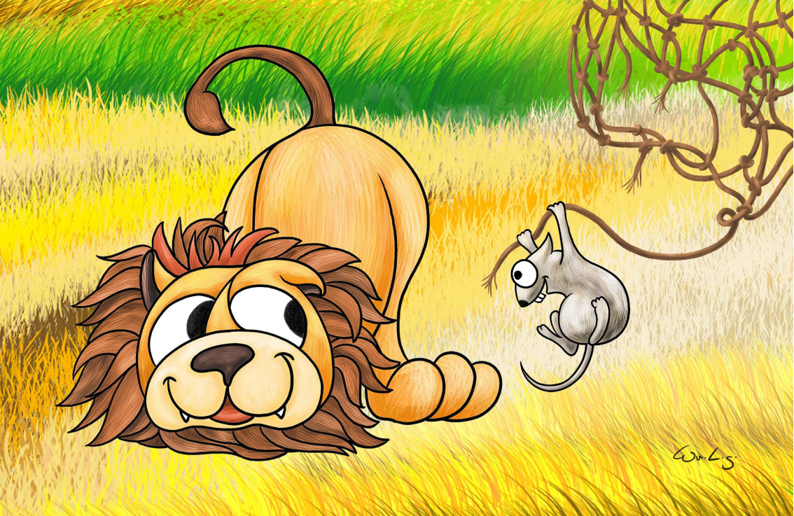 6. 獅子終於掙脫繩索,並誠心地向老鼠道謝與致歉,說:「謝謝你救了我,我不該因你看起來弱小而輕視你。」
