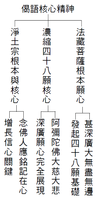 這首偈語是阿彌陀佛在法藏菩薩的時代,還沒有發四十八願之前的根本願心,可說阿彌陀佛發四十八願的根源。這個願心很深廣、很徹底、很圓滿,可說甚深廣大,無量無數,無盡無邊。有這個根本願心,才能發起偉大的四十八願。